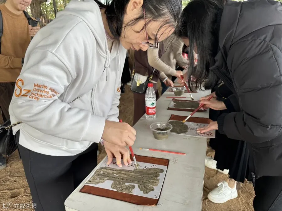 随后,大家来到过乌场,体验香云纱的过乌工序。当河泥中富含的盐分子和铁离子与薯茛中的单宁产生反应,香云纱便会焕发如黑珍珠般的色泽。大家用巧手均匀为巾纱涂满河泥,静置后又耐心浣溪,在体验过乌的过程中,女职工们充分感受了劳动人民的智慧与工匠精神。