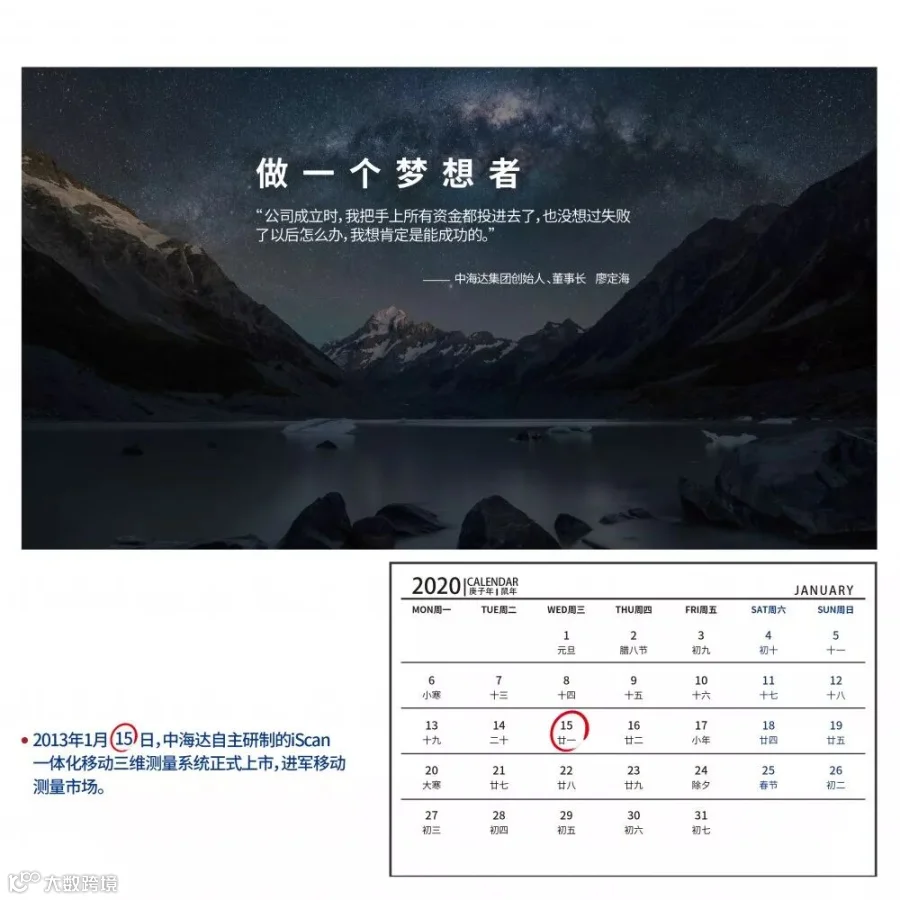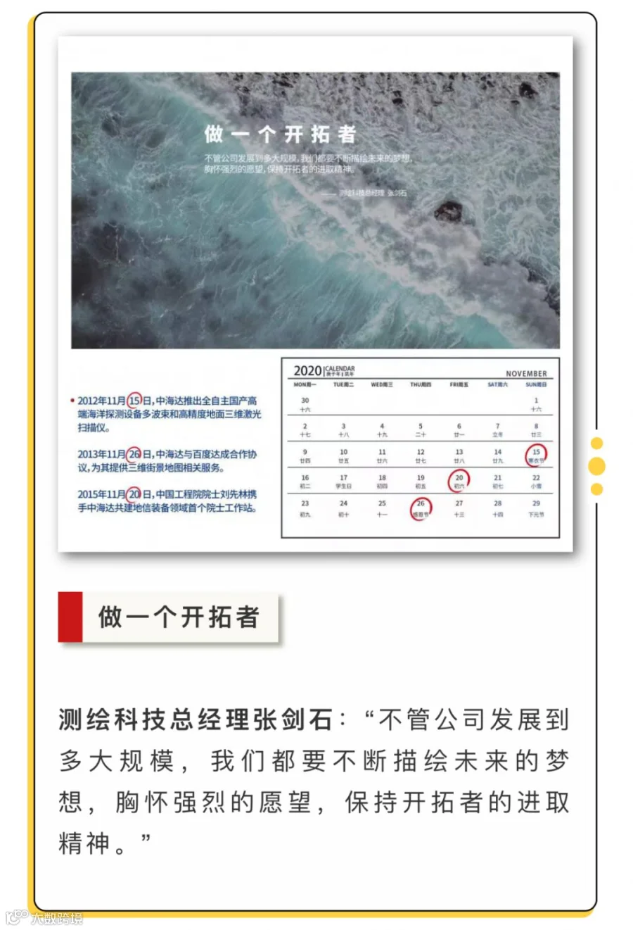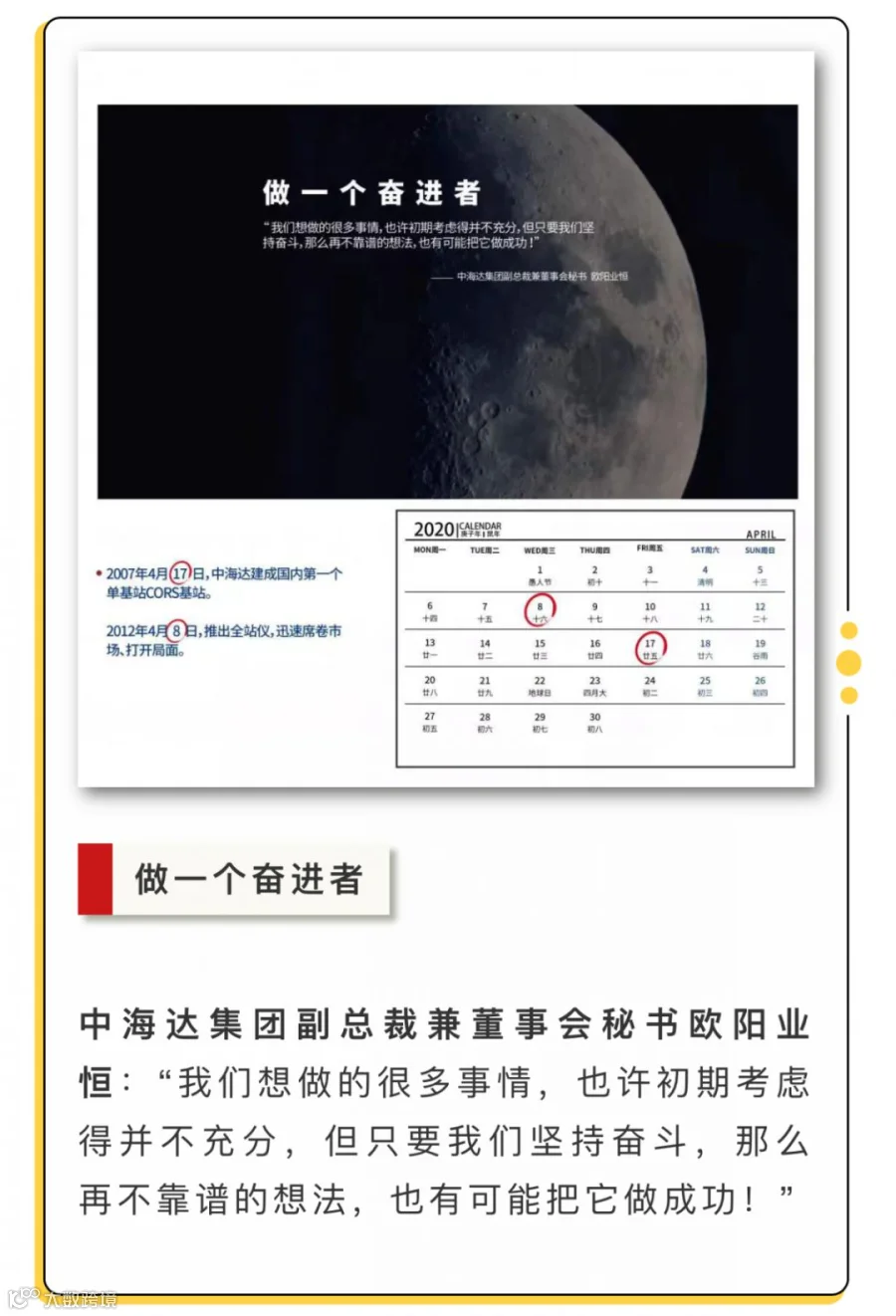 不管是中海达人,还是行业朋友,都是梦想路上的奋斗者。在中海达即将迈入第21个年头之际,我们从尺寸构思、时钟创意、不同人物身份指代等多方面融入了奋斗者的精神和理念,设计了一份“时间礼物”——中海达2020年月历,愿能在此时与所有奋斗者一起铭记过去、展望未来。下面我们一起来看看这本精美月历吧!