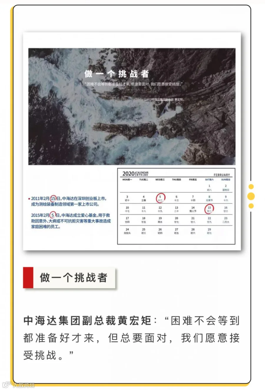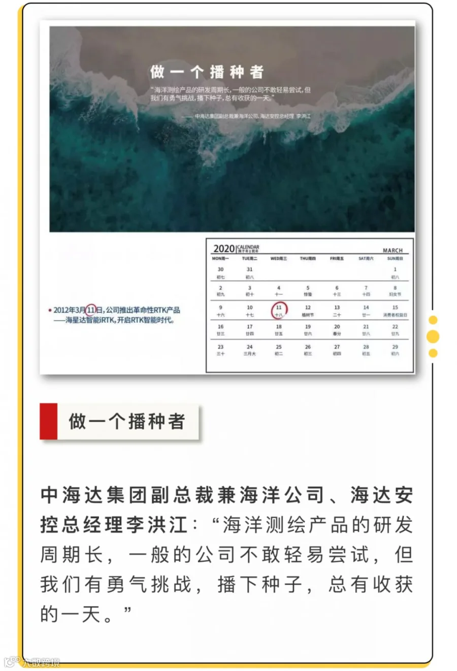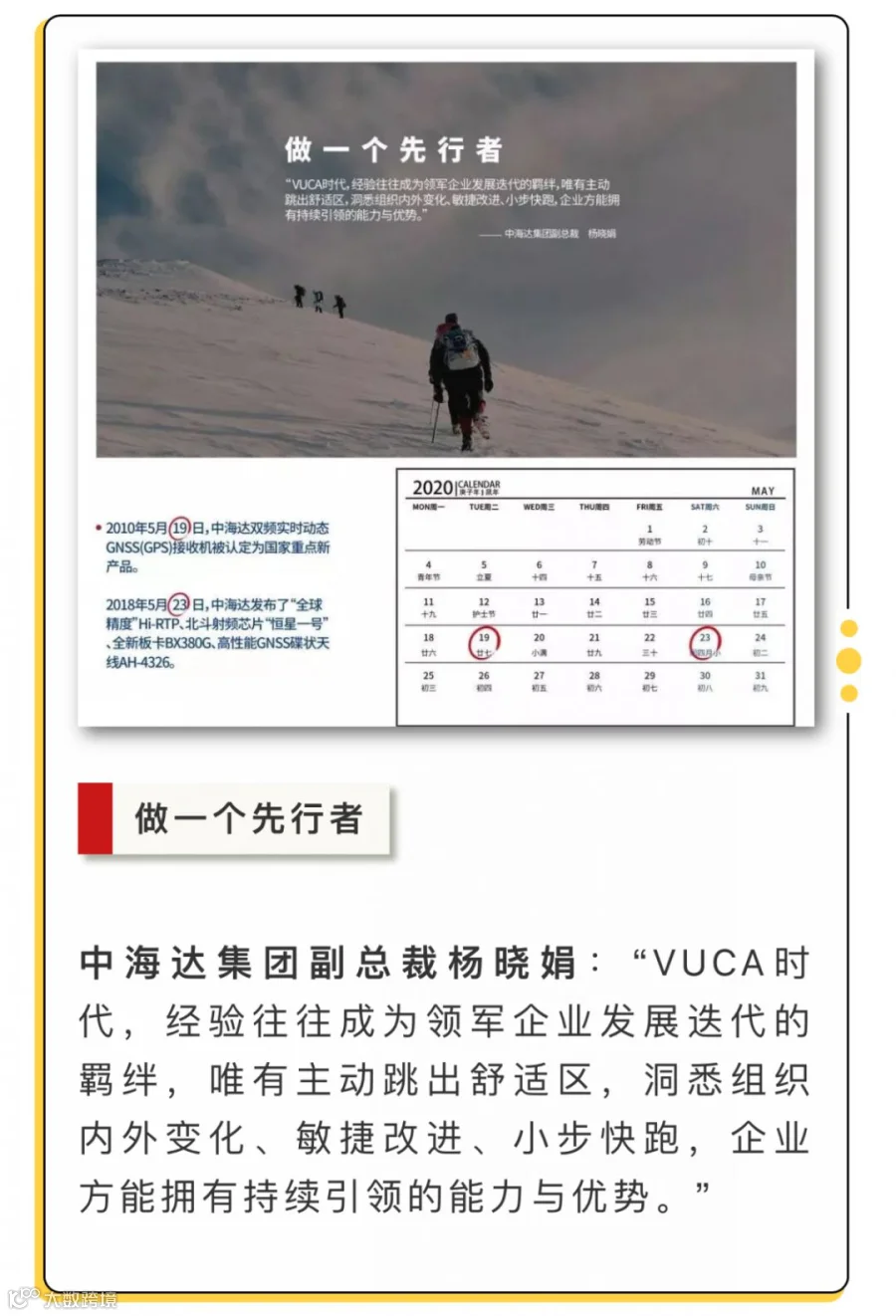 不管是中海达人,还是行业朋友,都是梦想路上的奋斗者。在中海达即将迈入第21个年头之际,我们从尺寸构思、时钟创意、不同人物身份指代等多方面融入了奋斗者的精神和理念,设计了一份“时间礼物”——中海达2020年月历,愿能在此时与所有奋斗者一起铭记过去、展望未来。下面我们一起来看看这本精美月历吧!