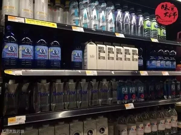 超市里成千上万的、各种品牌的饮用水层层叠叠。包装设计都是蓝色、绿色,图案上有冰山、有瀑布。
