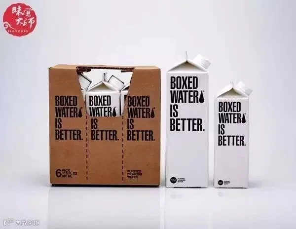 潮人很喜欢“Boxed water”的简约设计,白纸盒、黑色字体,品牌名称赤裸裸地标榜着一种生活方式。