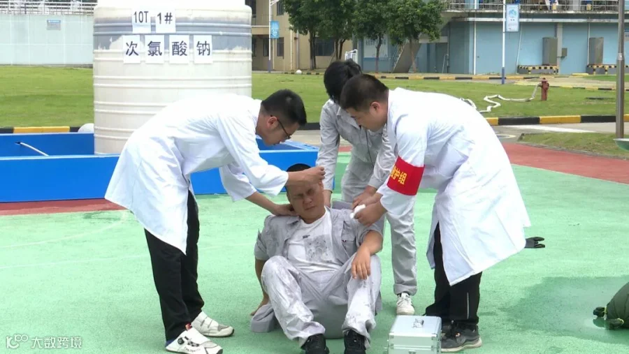巡检人员在加药区域进行日常巡检时,发现一起次氯酸钠泄漏事故,其中一名人员在尝试堵漏过程中操作不慎被药剂喷溅到身体,事态紧急。