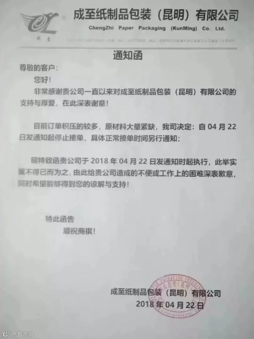 成至纸制品包装(昆明)有限公司:自4月22日发通知起停止接单。