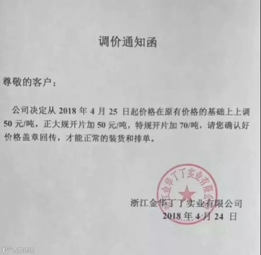 浙江金华丁丁实业有限公司:从2018年4月25日起价格在原有价格的基础上上调50元/吨。