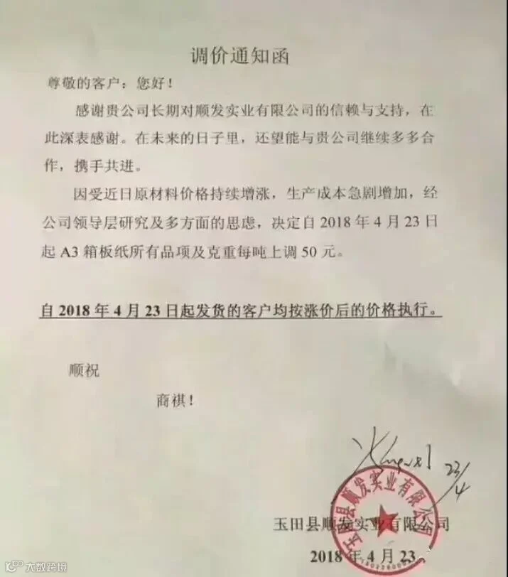 玉田县顺发实业有限公司:自2018年4月23日起,A3箱板纸所有品项及克重每吨上调50元。