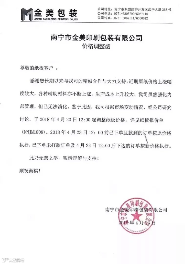 南宁市金美印刷包装有限公司:近期原纸价格上涨幅度较大,各种辅助材料亦不断上涨,生产成本上升较大,于2018年4月23日12:00起调整纸板价格。