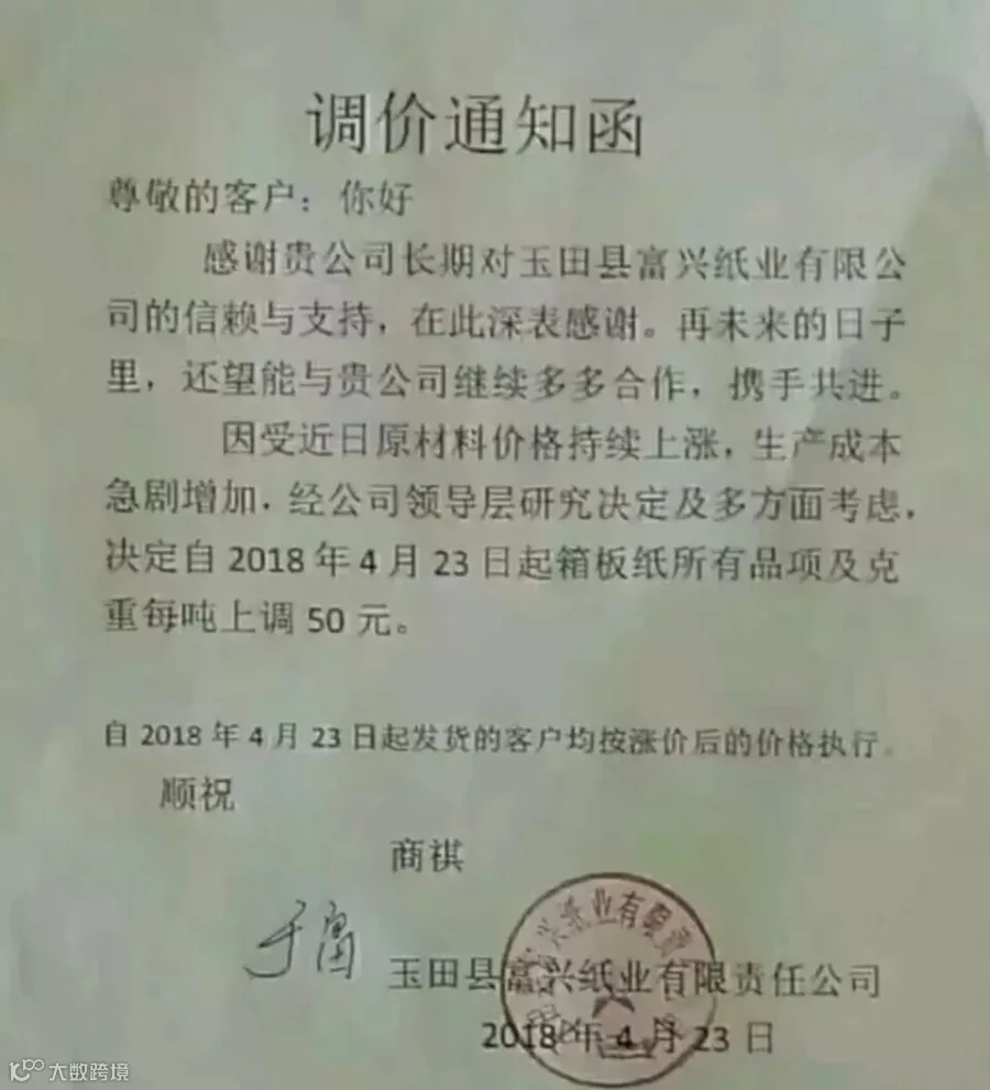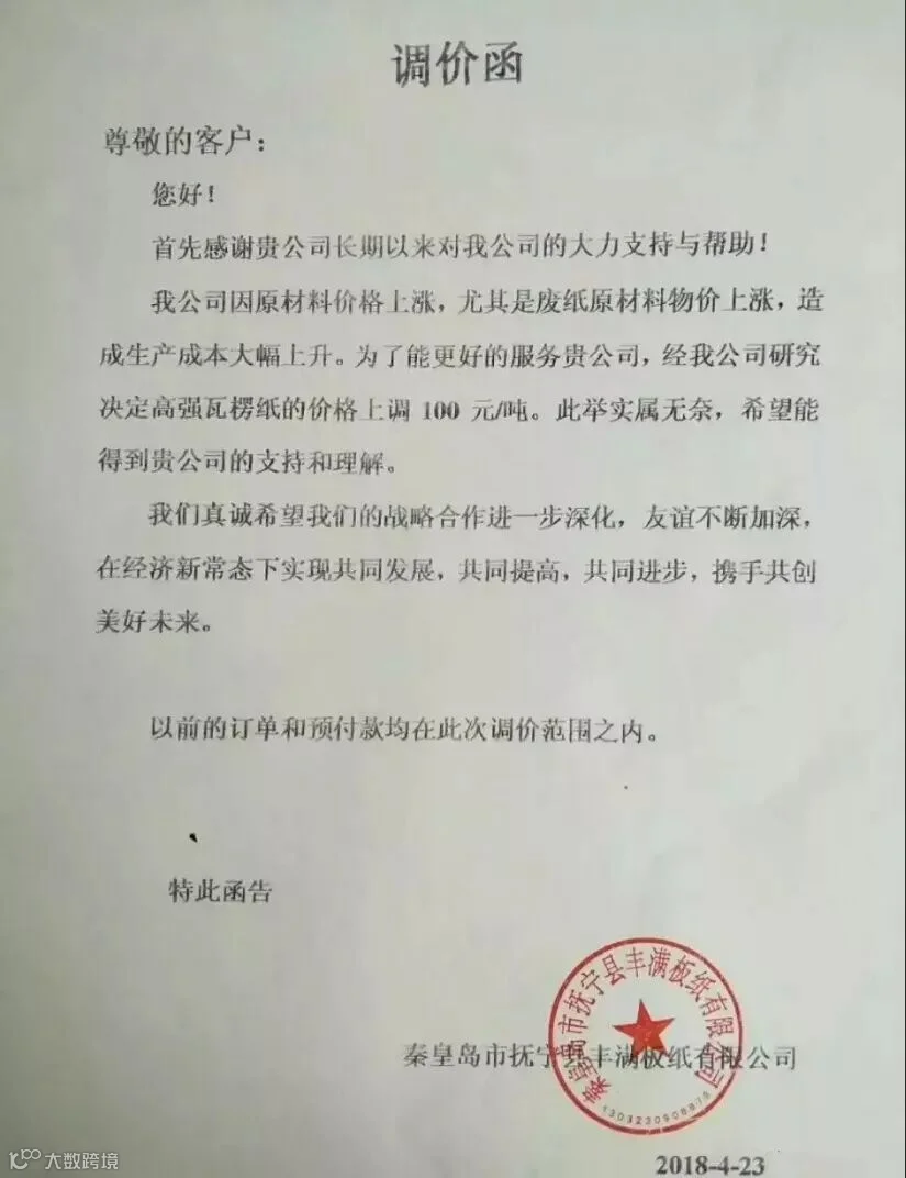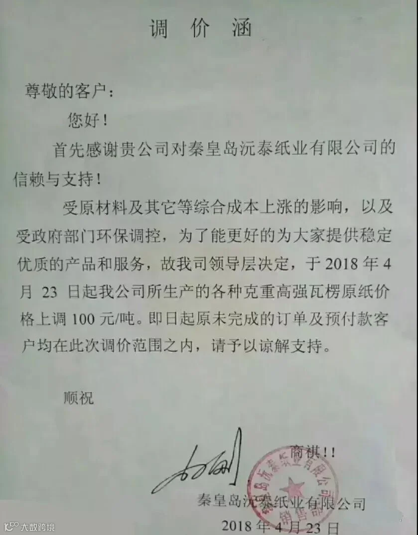 秦皇岛沅泰纸业有限公司:自2018年4月23日起,我司生产的各种克重高强瓦楞纸价格上调100元/吨,未完成订单及预付款也在此调价范围内。