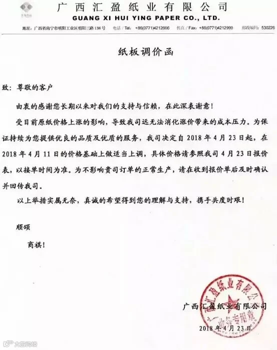 广西汇盈纸业有限公司:自2018年4月23日起,(纸板)在2018年4月11日的价格基础上做适当上调。