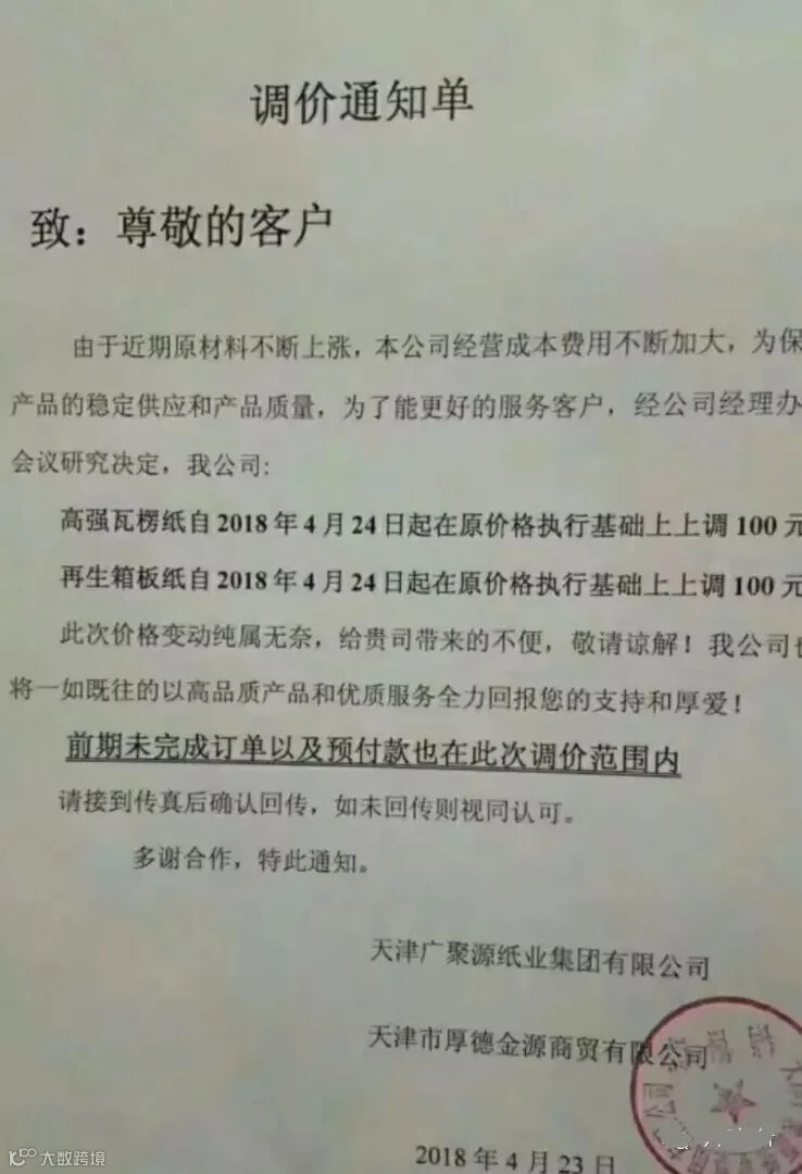 天津广聚源纸业集团有限公司/天津市厚德金源商贸有限公司:自2018年4月24日起,高强瓦楞纸在原价格执行基础上上调100元/吨;再生箱板纸在原价格执行基础上上调100元/吨。前期未完成订单及预付款也在此调价范围内。