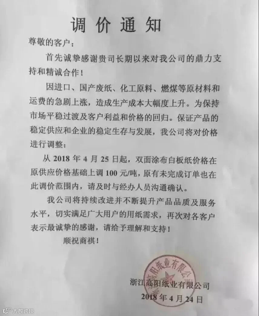 浙江高阳纸业有限公司:从2018年4月25日起,双面涂布白板纸价格在原供应价格基础上调100元/吨。