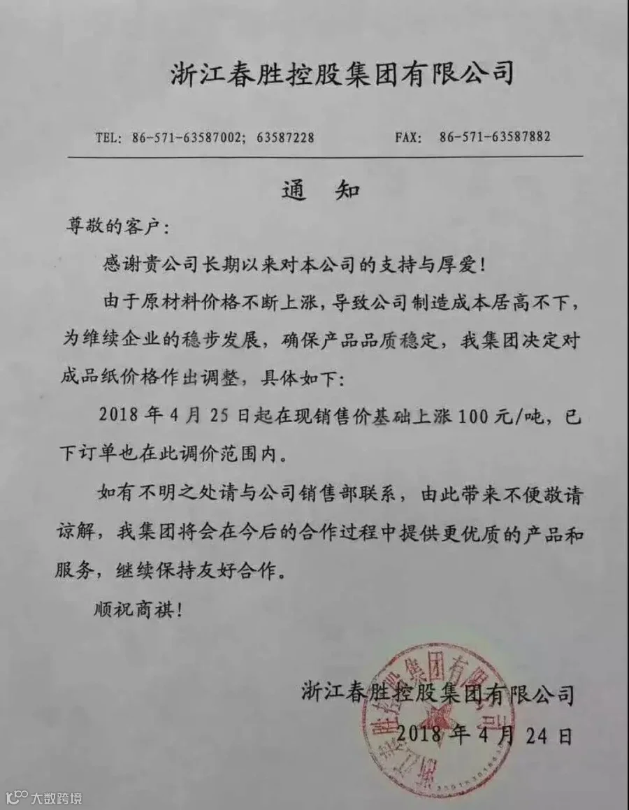 浙江春胜控股集团有限公司:成品纸价格自2018年4月25日起在现销售价基础上涨100元/吨。