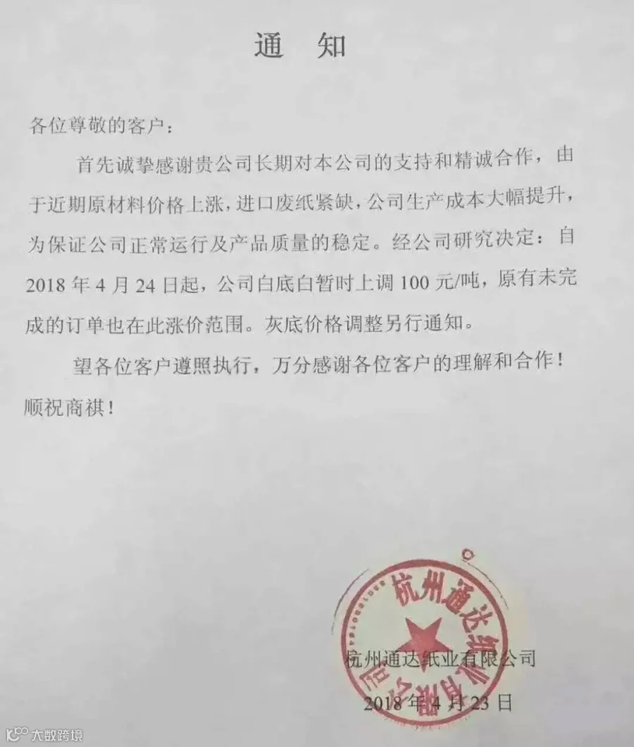 杭州通达纸业有限公司:自2018年4月24日起,公司白底白暂时上调100元/吨。