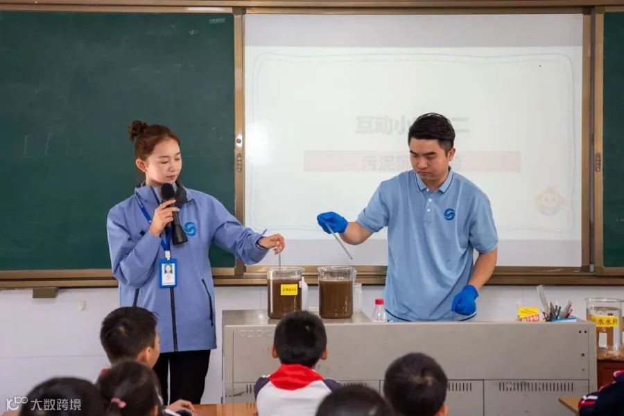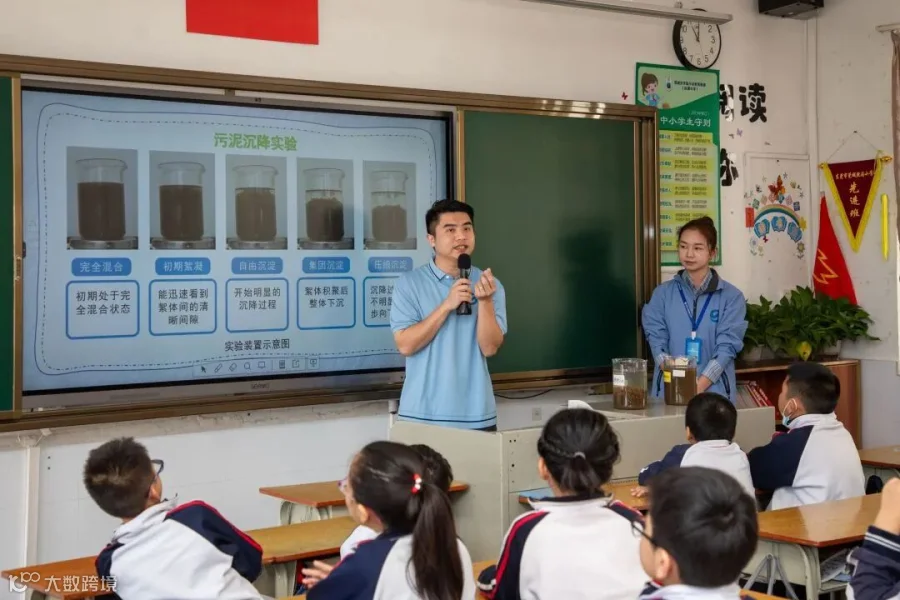 净水公司派出专业的宣教讲解员团队开展课程。讲解员们从水资源现状开始课程,并以身边常见的事物作为示例,详细生动地介绍了污水处理厂的池体、设备、设施等,并用问答的形式,让课堂所教的环保知识真正成为学生们的所学。理论讲解后,讲解员特意带来了各种水样,邀请学生们亲自观察水样之前的区别,除此之外,讲解员还准备了污泥沉降性实验,用实验模拟污水处理厂中二次沉淀池的作用,让学生们在学校也能感受到污水处理厂日常运作的场景。