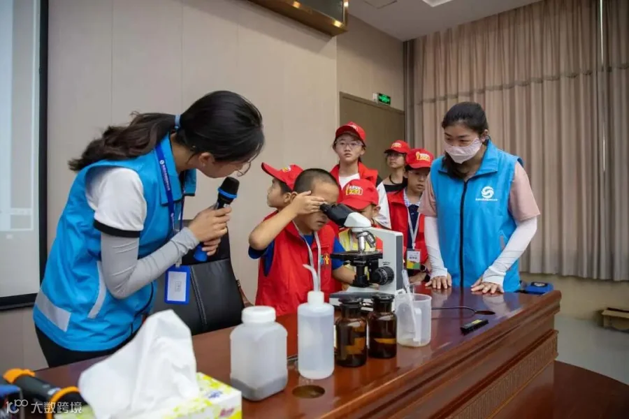 在正式研学污水处理过程之前,陈瑞芳带领学生和家长们体验了“生物相镜检实验”,她将水样制作成标本,让大家借助显微镜观察到污水中的微生物,感受独特的微观世界。