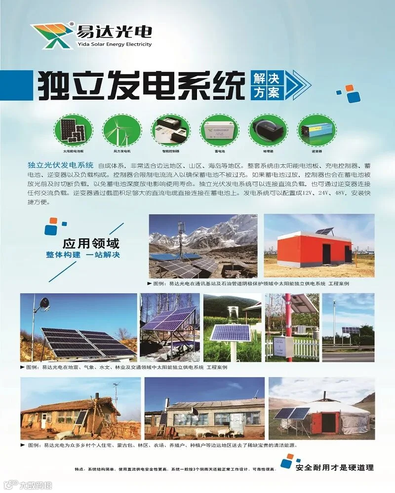 杭州易达光电有限公司专注太阳能光伏发电20多年,厂家直销太阳能发电设备,批发太阳能板,胶体电池,控制器,逆变器,光伏支架,太阳能路灯ups蓄电池,在全国东北辽吉黑西北新疆内蒙大区建立了本地化仓储运营,整体构建一站解决方案设计,快速交接。