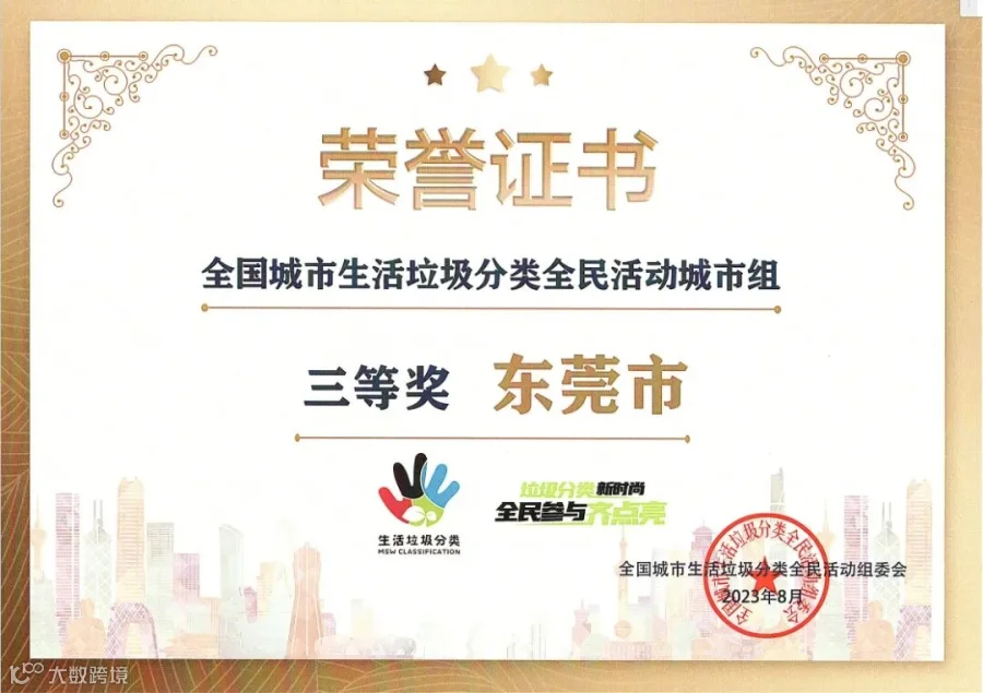 今年8月,在住房和城乡建设部主办的“垃圾分类新时尚、全民参与齐点亮”活动颁奖典礼上,东莞市在全国297个地级及以上城市中脱颖而出,荣获全国城市生活垃圾分类全民活动城市三等奖。日前,这份荣誉证书送到了市垃圾分类办手中。