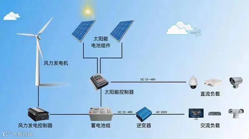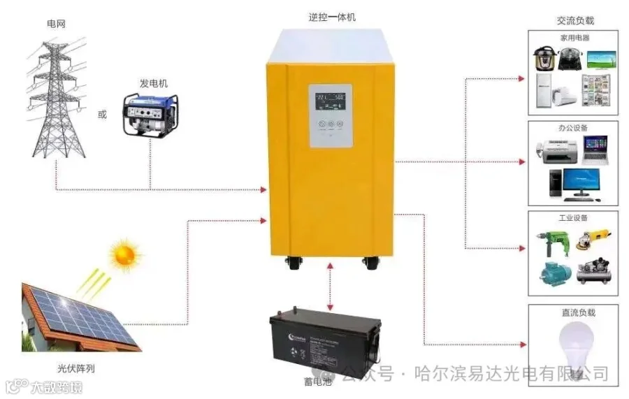 • 逆变器:由于太阳能的直接输出一般都是12VDC、24VDC、48VDC,而很多场合需要提供220VAC、110VAC的交流电源,因此需要使用DC-AC逆变器,将直流电能转换成交流电能。