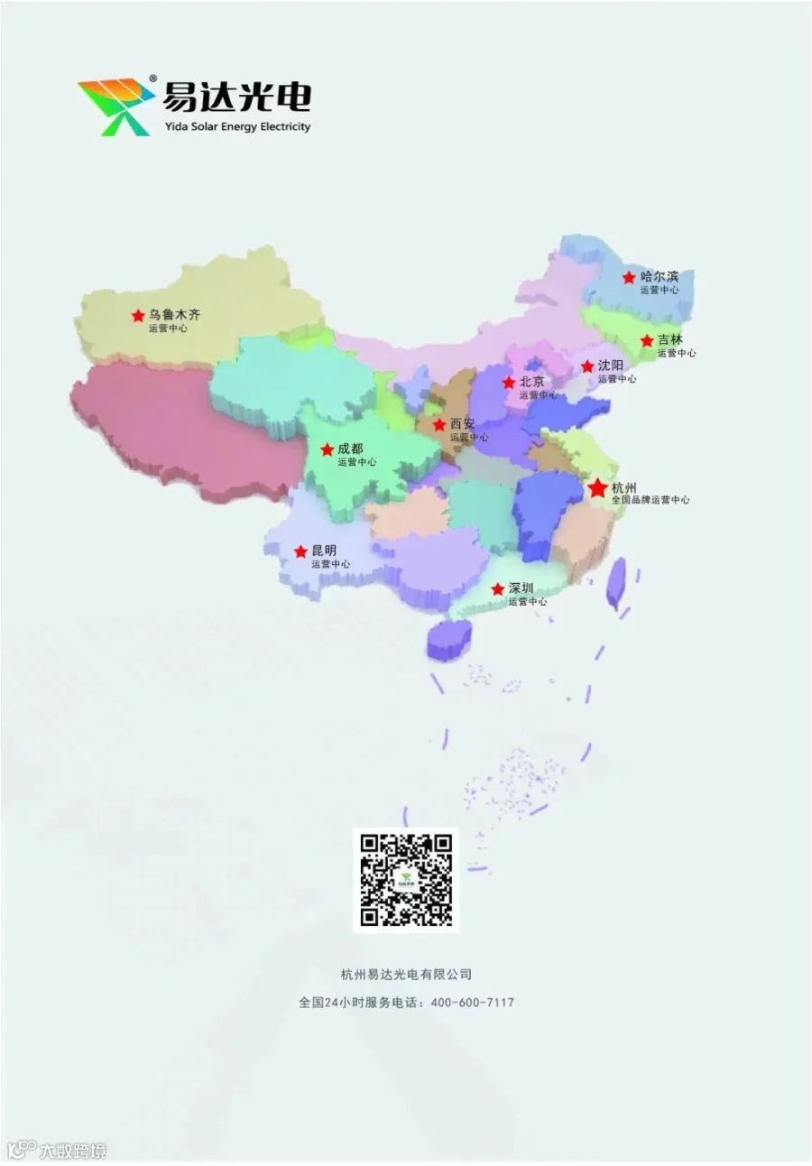 易达光电品牌运营总部位于杭州临平新城美莱国际中心,在沈阳、长春、哈尔滨、西安、乌鲁木齐、昆明以及京津冀、珠三角各节点城市设立本地化运营办事处、分子公司,全国建立并完善“一核九星”的运营服务网络,实现全国化市场,本地化服务。是一家专注于太阳能发电系统设计、生产、销售与安装的高科技企业。公司秉承科技创新、绿色环保的理念,致力于为用户提供高效、可靠、节能环保的太阳能发电解决方案。