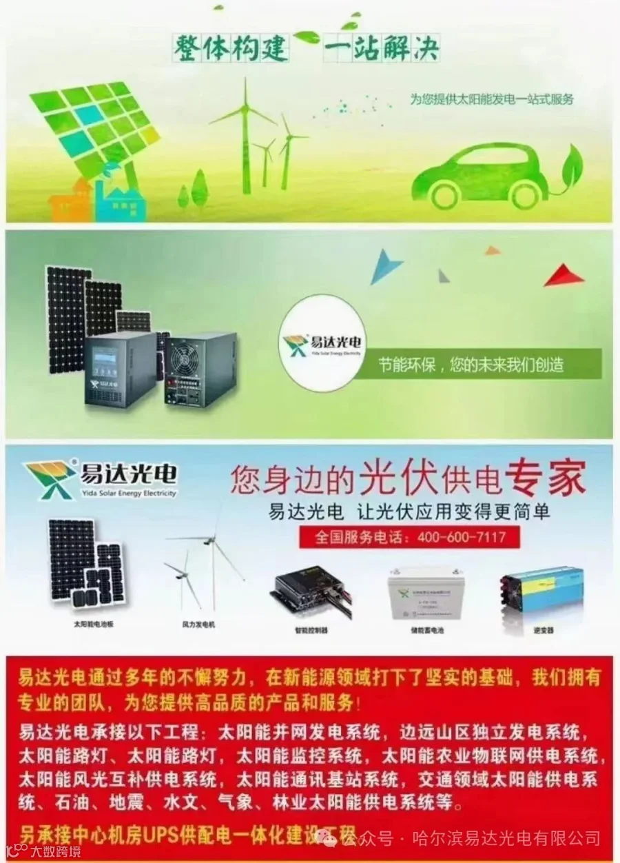 杭州易达光电有限公司专注太阳能光伏发电20多年,厂家直销太阳能发电设备,批发太阳能板,胶体电池,控制器,逆变器,光伏支架,太阳能路灯ups蓄电池,在全国东北辽吉黑西北新疆内蒙大区建立了本地化仓储运营,整体构建一站解决方案设计,快速交接。