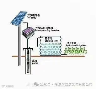 水泵工作:交流电驱动光伏水泵工作,实现水的提升或输送。