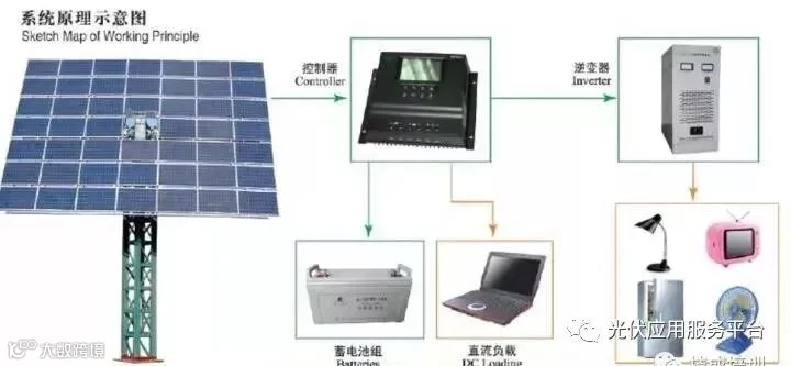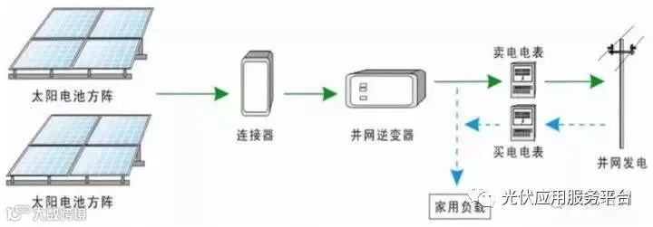 太阳能电池组件→逆变控制器→配电箱及智能电表→公共电网