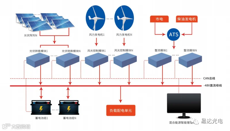 通信基站供电系统有太阳能电池组件、风力发电机、通信用混合能源管理一体化控制器、蓄电池组及蓄电池户外保温箱构成。其中通信用混合能源一体化控制器采用模块化设计,完全满足通信用混合能源一体化控制器采用模块化设计,完全满足通信电源标准,采样模块化控制,系统分为市电模块,光伏模块,风机模块,柴油机模块,各个模块单独工作,又相互协调,方便维护及扩容,符合基站电源系统标准。可以根据不同的场合,不同的地区,不同的负载要求采用不同的模块配比。