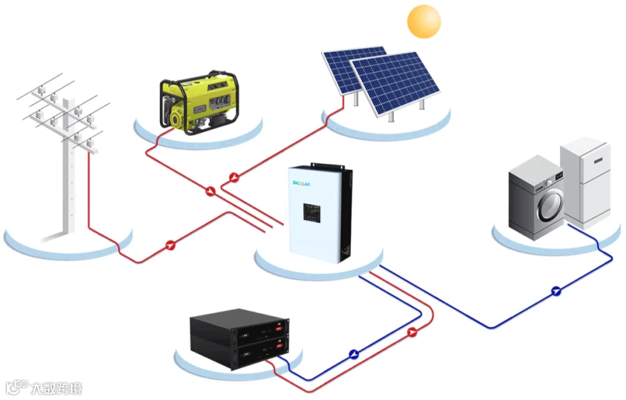 典型离网系统中的主要设备有光伏组件、离网逆变器、胶体蓄电池组、太阳能控制器、配电箱、用电负载;最精简的离网系统也可以只包含:光伏组件,离网控制逆变器一体机、胶体蓄电池。光伏组件接入到太阳能控制器后,首先满足负载使用,之后将多余的电量存储于电池中,以备夜间及阴雨天使用,如果蓄电池电量耗尽,大部分逆变器还可以接入市电或柴油发电机作为备用能源,从而确保负载不会因缺电而受到影响。