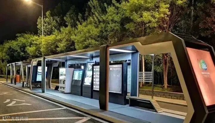 走出家门乘坐公交,充满未来感的智慧公交站让人等车不再无聊。站亭顶部安装的光伏板可为公交站亭提供绿色能源。