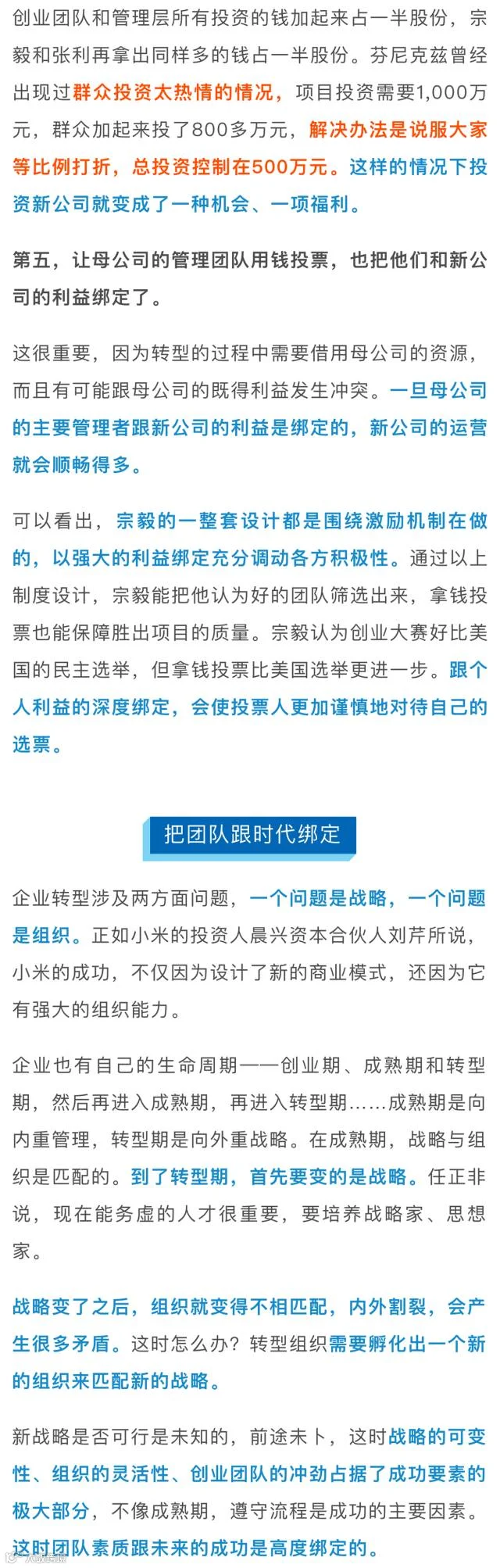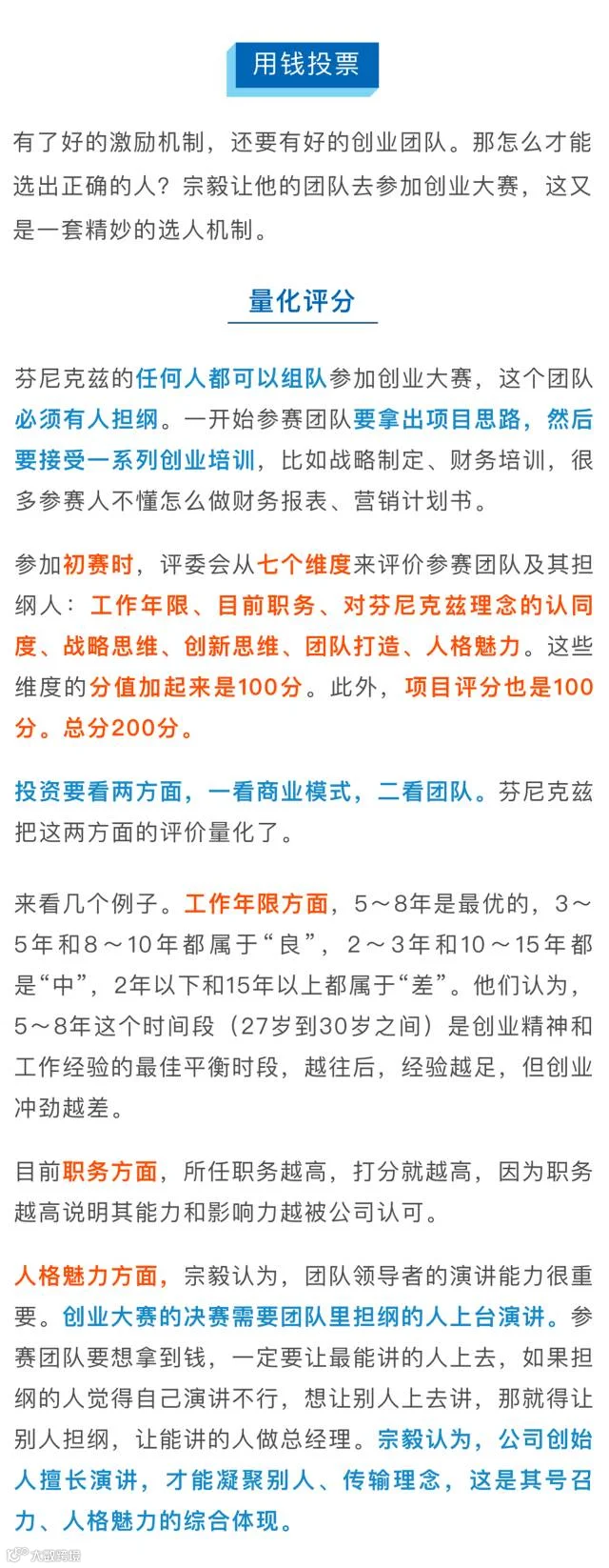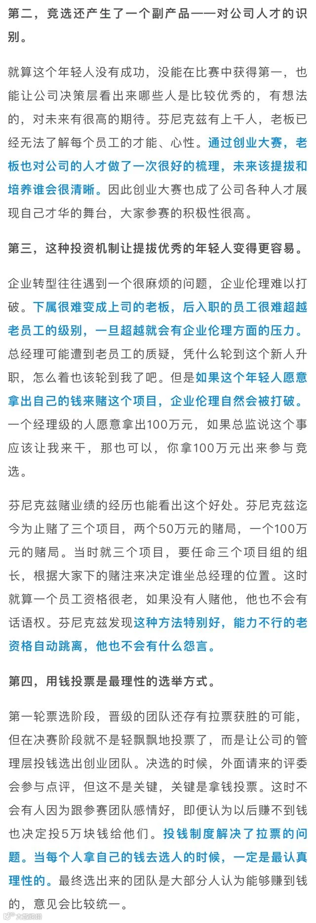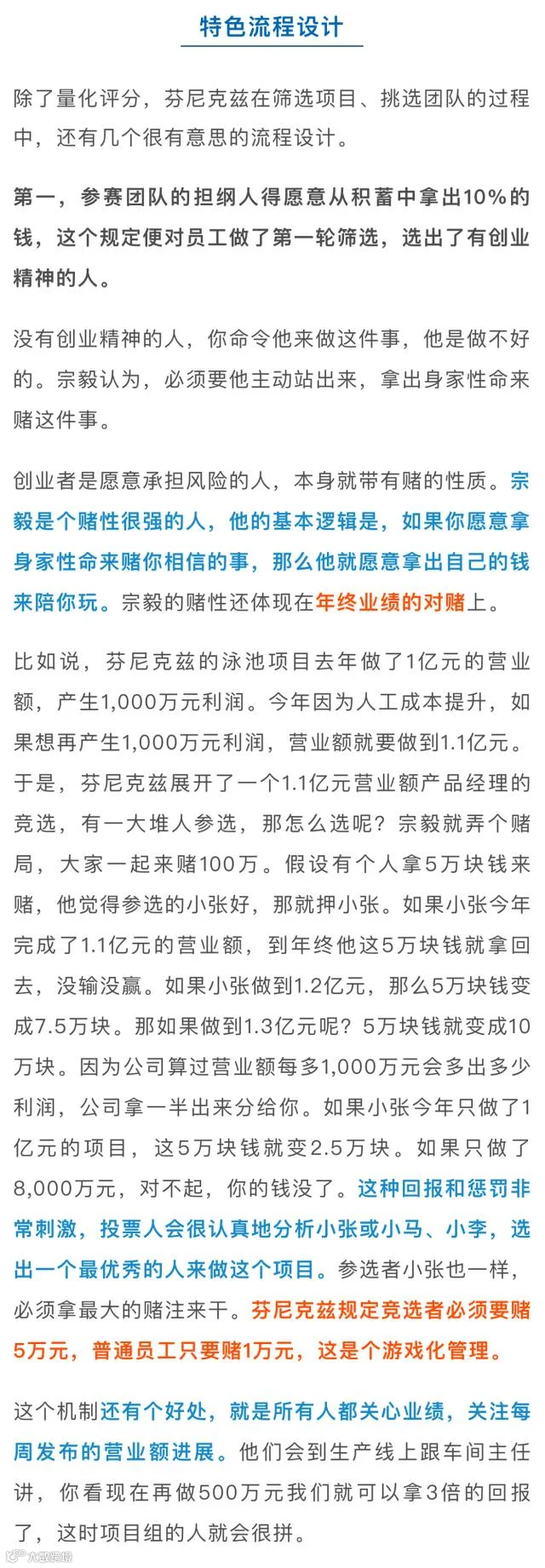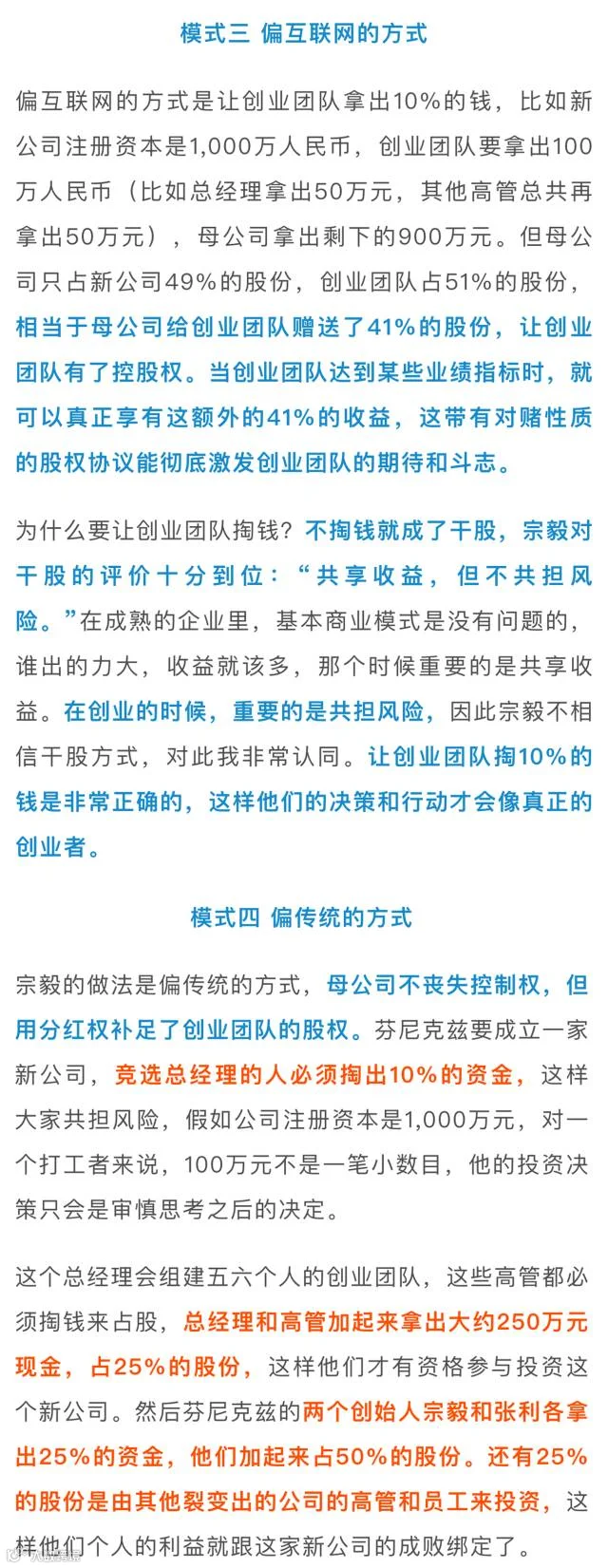 芬尼克兹的“裂变式创业”有以下几个要点颇具参考价值:1. 母公司创始人控股新公司,同时收益权上充分激励创业团队;2. 创业团队成员必须掏钱参股,以身家性命赌未来;3. 用钱投票,可杜绝人情关系,选出最好的创业项目和团队;4. 人人平等,每位员工都可报名参加创业大赛,打破新员工职位无法超过老员工的企业伦理困境。