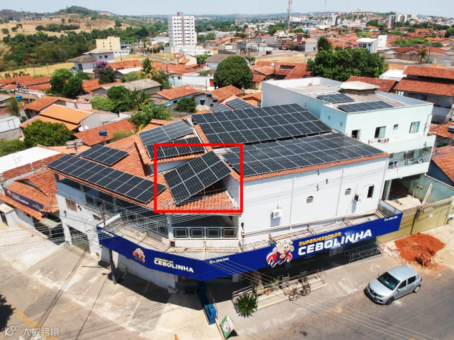除户用项目之外,昱能微型逆变器在多朝向屋顶应用的同时也延申到了工商业领域。去年在巴西戈亚斯州地区装机并网的工商业光伏项目,安装在了当地一个超市的屋顶上,其装机容量为48.6kW。在项目设计选型之初,如下图圈出位置,考虑到侧墙阴影遮挡等因素,在组件布局时,设计了一定的倾角,因此整个屋面的组件朝向及倾角更为复杂多样。基于此情况,项目全部选用了昱能微型逆变器产品,使每个屋面组件的发电互不影响,保障了系统的发电效率。