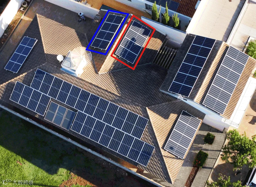 近日,位于巴西伊塔波利斯地区有一系统容量为22.62kW的户用光伏项目。在项目设计之初,业主希望每个屋面都能得到有效利用。经过项目设计,最终光伏组件被安装在了7个不同朝向的屋面,并配合使用昱能科技微型逆变器产品,让屋顶得到了充分的利用。在该电站实际运行中,受多朝向影响,不同屋面组件接受的太阳辐射量有所不同,其发电量相差较大。以下图中圈住的组件为例,红色和蓝色圈住的两个朝向屋面分别对应西面和东面。