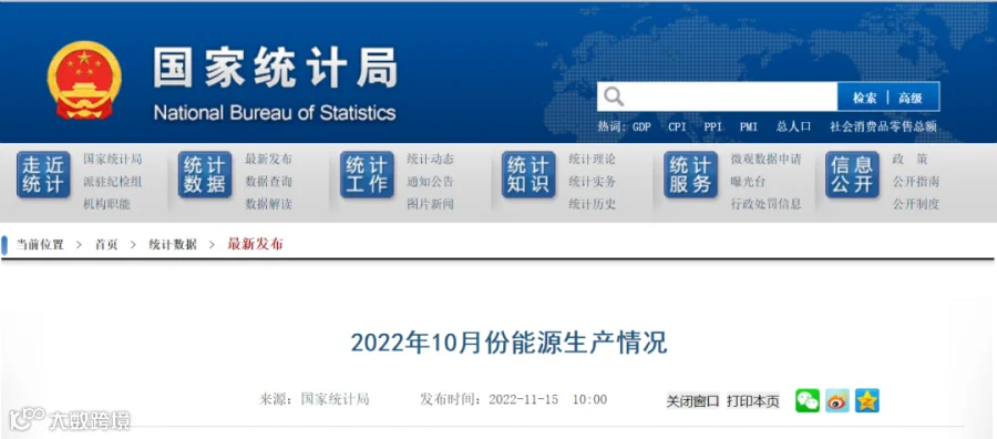 近日了解到,11月15日,国家统计局公布了2022年10月份能源生产情况。