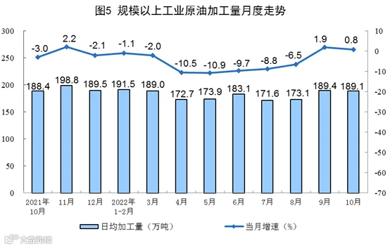 原油加工增速放缓。10月份,加工原油5862万吨,同比增长0.8%,增速比上月放缓1.1个百分点,日均加工189.1万吨。1—10月份,加工原油55588万吨,同比下降4.5%。