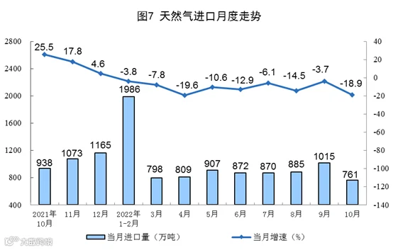 1—10月份,生产天然气1785亿立方米,同比增长6.0%。进口天然气8874万吨,同比下降10.4%。