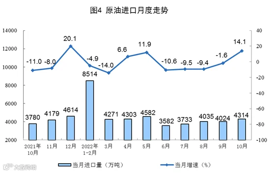 原油生产稳定增长,进口由降转升。10月份,生产原油1722万吨,同比增长2.5%,增速比上月加快1.1个百分点,日均产量55.6万吨。进口原油4314万吨,同比增长14.1%,上月为下降1.6%。