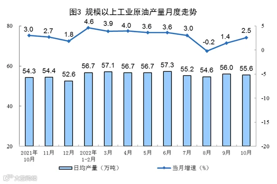 1—10月份,生产原油17098万吨,同比增长3.0%。进口原油41353万吨,同比下降2.7%。