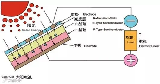 在硅晶体薄片表面制作PN结,在上下表面做电极构成太阳能电池。上图显示的仅是硅太阳能电池的一小块截体。电池主体是PN结,为了防止硅晶体薄片对太阳光产生反射,把上表面制成无反射的绒面;为进一步减小反射,在上面还要敷一层透明的减反射膜;在电池上表面有电极线与N型半导体连接,在电池下表面有电极线与P型半导体连接。