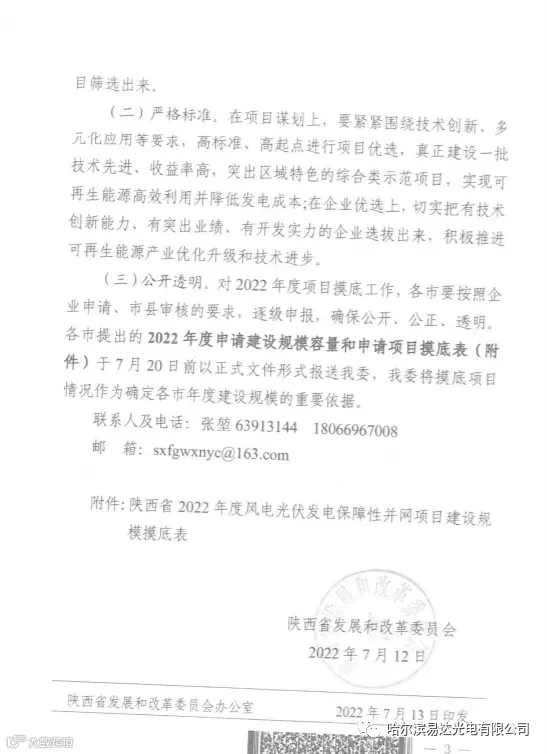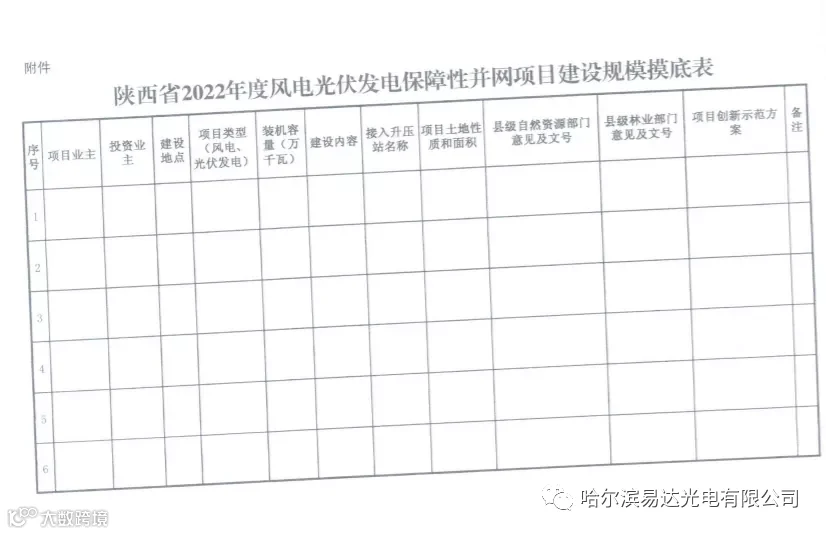 哈尔滨易达光电有限公司了解到,陕西发改委发布关于开展2022年风电光伏发电保障性并网规模摸底工作的通知。