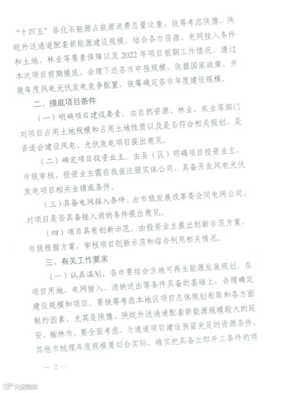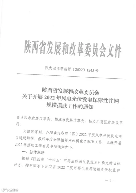 了解到,陕西发改委发布关于开展2022年风电光伏发电保障性并网规模摸底工作的通知。