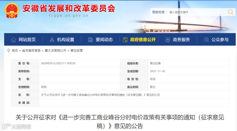 11月30日,安徽省发改委发布了关于公开征求对《进一步完善工商业峰谷分时电价政策有关事项的通知(征求意见稿)》意见的公告。