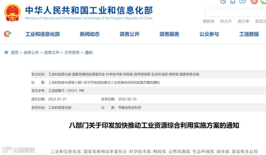 八部门关于印发加快推动工业资源综合利用实施方案的通知