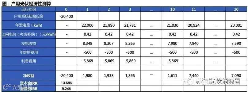 按2021年最新数据测算,户用全投资IRR约为9.2%,极具投资价值:全国范围内的户用光伏项目操作差异 性较大,装机成本在2.72~4.94元/瓦之间浮动。取装机成本中值3.4元/瓦做经济性分析:假设年有效利用小 时1100h,假设系统寿命为20年,每年发电量衰减0.5%;采用全额上网模式,上网电价采用户用大省山东 的燃煤基准价0.395元/瓦;考虑年维修成本0.05元/瓦。考虑2021年0.03元户用补贴,项目按照70%贷款, 贷款期限10年等额本息,贷款利率4%,全投资IRR可达9.2%,户用光伏已具备经济性。