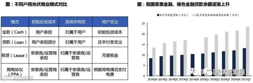 金融渠道引入是国内户用光伏快速发展的重要助推因素。截至2021年,我国户用光伏的应用场景主要在农村,数万元的初始投资成本对农村居民而言仍是一笔不小的金额,早期因为光伏形象较差,大多银行将光伏项目列入禁贷名单,而且由于户用项目分散且金额不大,银行也不愿意做此类业务,户用光伏推动受到阻碍。近年来集成 商、安装商开始积极引入贷款、租赁等创新金融模式,户用光伏的安装大大降低门槛,较大刺激装机。