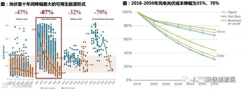 可持续性分析:装机成本继续下降,经济性将愈发明显:从2010-2020年来看,光伏是成本降幅最大的可再 生能源形式,全球光伏发电的度电成本已从2010年的0.37$/kWh快速下降至2020年的0.048$/kWh,降幅 高达87%,BP预计到2050年光伏的成本较2018年将下降65-70%。光伏资源禀赋优异、成本快速下降带来 全球平价,带来行业较大增量空间,有望成长为主力能源。