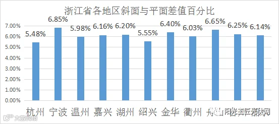 图为1-9所示,浙江省各地区平面峰值日照时数和斜面峰值日照时数差值得百分比,宁波最大为6.85%,杭州最小为5.48%。这里还是基本符合纬度越高斜面和平面的光照时长差异越大,纬度越低斜面和平面的光照时长差异越小的规律。