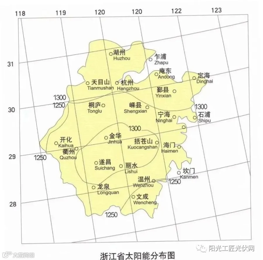 整个浙江省的太阳能资源在全国范围内属于中等偏下的水平,最低年均峰值日照时数1250小时左右,最高也只有1300小时左右,太阳能资源整体分布差异比较小。主要原因还是土地面积小和纬度跨度小,南北跨度也就3°左右,东西经度跨度也很,小从118°到122.5°只有4.5°。所以气候条件很难形成较大的差异。