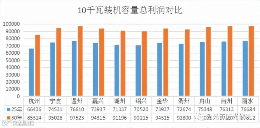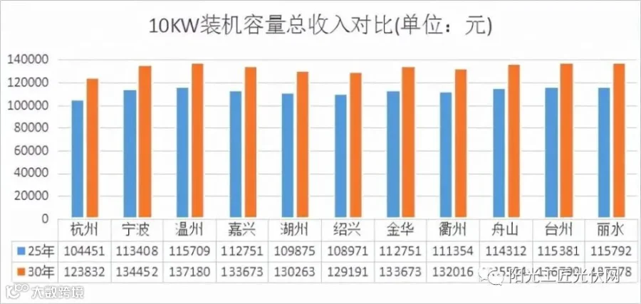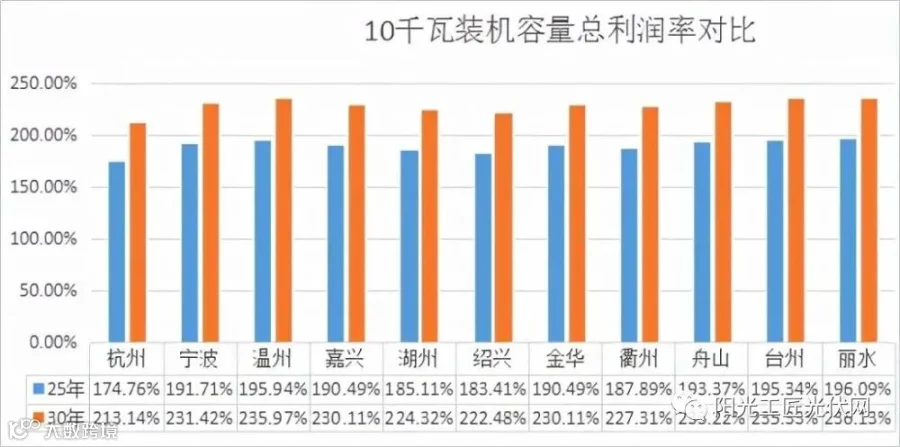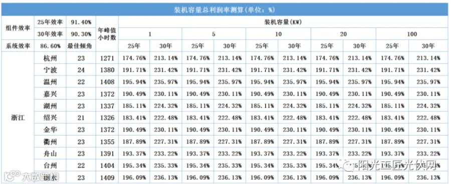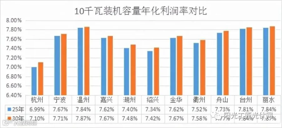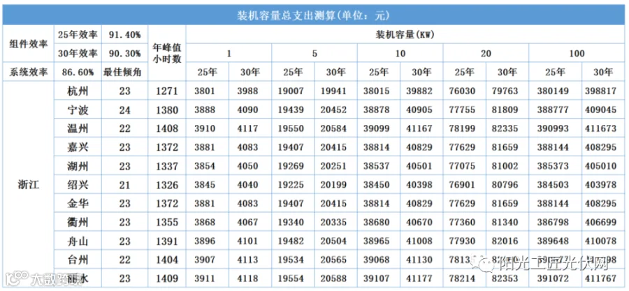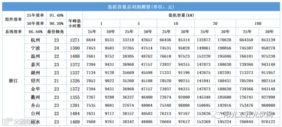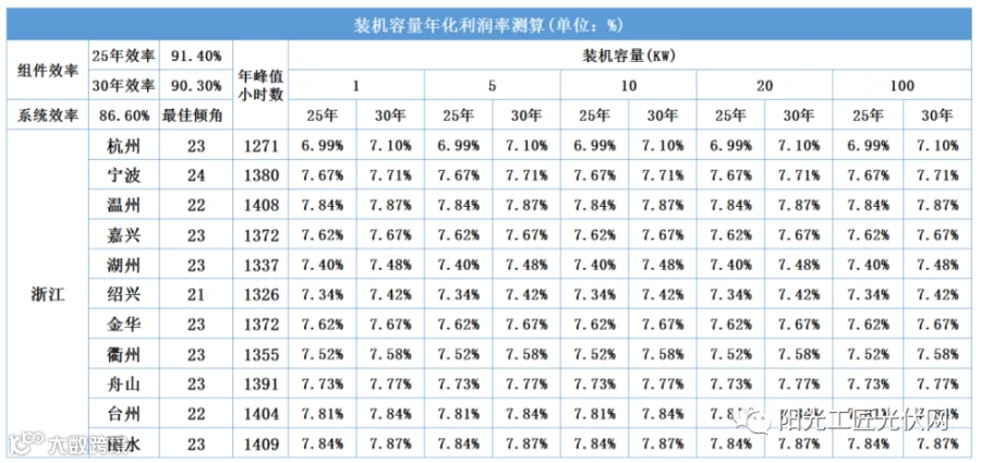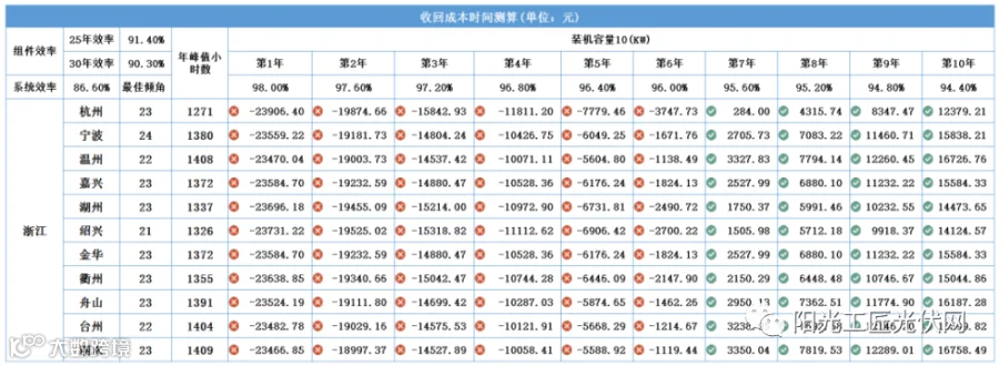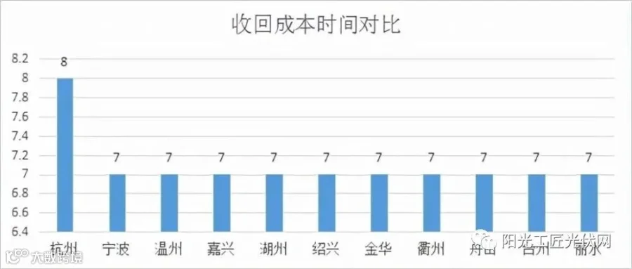按照目前标杆电价计算,在没有补贴的情况下,整个浙江省基本上都能在7年以内完成成本初始投入资金的回收,也就是我们常说的回本。仅杭州回本时间稍稍晚点,需要第8年才能完成成本回收,由于光伏电站前期的发电效率更高和运营成本相对更低,实际回本时间可能会提前到来,也大概率能在7年内完成成本回收。