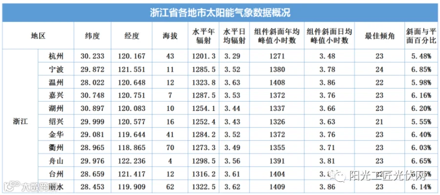 由于整个浙江省太阳能最丰富的时间主要集中在夏季,冬季春季和秋季大部分时间都是阴雨天气较多,所以在设计光伏电站的时候,电池组件的倾角应当以考虑夏季采光条件为主。所以浙江地区适合采用最佳倾角比纬度低5到8度的样子,这样能够接受更多夏季太阳光的直射。