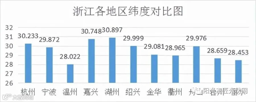 从图1-6所示,可以看出浙江省纬度最高的是湖州市,纬度最低的是温州市。