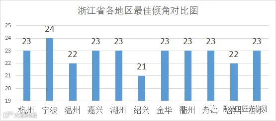 从图1-7所示,可以看出浙江省太阳能光伏电池组件最佳倾角基本都在22度23度,只有宁波市为24度,绍兴市为21度。